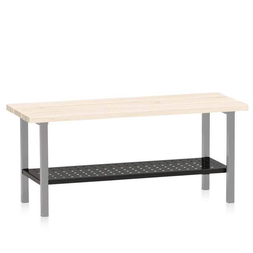 Skohylla för sittbänk. Skohyllan hakas fast på mellanstaget på benbockarna i all enkelhet. Hålen underlättar rengöring och förhindrar smuts- och skräpansamligar.